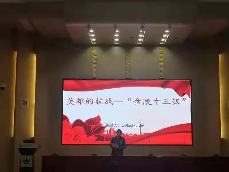 随后,2020级赵元梓同学带来了《抗战的英雄——金陵十三钗》故事讲述,赵元梓同学语句铿锵,神情随着故事的推动而不断变化着。通过赵元梓同学的讲述,这十三位在抗战历史中默默无闻的英雄被生动地呈现在所有人面前,同学们仿佛又置身那个战火纷飞的年代,被前赴后继的英雄们所拯救。是啊,在抗战中的每一位英雄,都是我们不该遗忘的,所有烈士的故事,都是我们应该铭记的!我们应该记住他们。