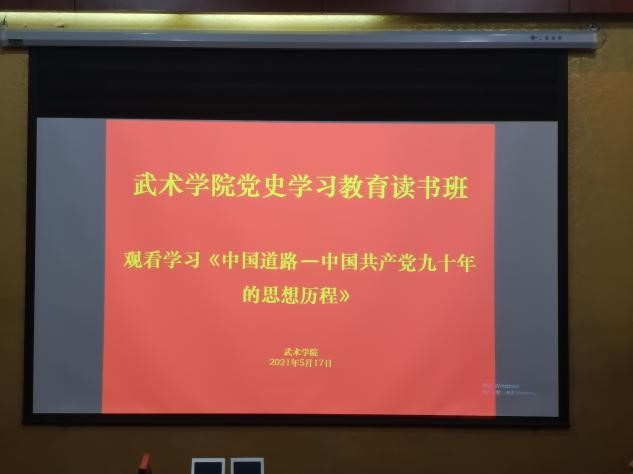 为深入开展党史学习教育,从党的百年伟大奋斗历程中汲取继续前进的智慧和力量,推动党史学习教育进一步贯彻落实。5月17日下午3点武术学院党委在学院会议室组织观看学习《中国道路—中国共产党九十年的思想历程》。学院全体行政人员,武术业校,各年级辅导员,各教研室主任、书记,以及部分老师、学生党员参会学习。