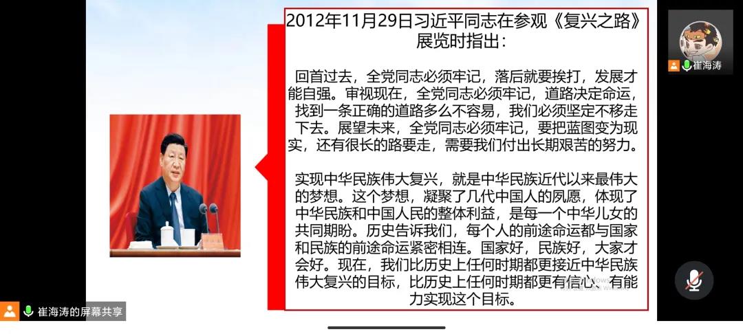 按照会议议程,第一部分,预备党员崔海涛带领大家学习《实现中华民族伟大复兴是中华民族近代以来最伟大的梦想》。习近平总书记在讲话中强调:回首过去,全党同志必须牢记,落后就要挨打,发展才能自强。展望未来,全党同志必须牢记,要把蓝图变为现实,还有很长的路要走,需要我们付出长期艰苦的努力。