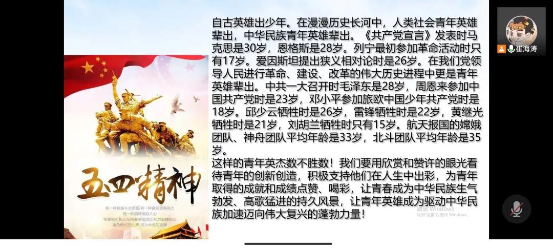 第三部分,预备党员崔海涛带领我们学习《习总书记在纪念五四运动一百周年大会上的讲话》。习近平总书记在讲话中表示:五四运动,孕育了以爱国、进步、民主、科学为主要内容的伟大五四精神,其核心是爱国主义精神。新时代中国青年要继续发扬五四精神,以实现中华民族伟大复兴为己任,不辜负党的期望和人民的期待。