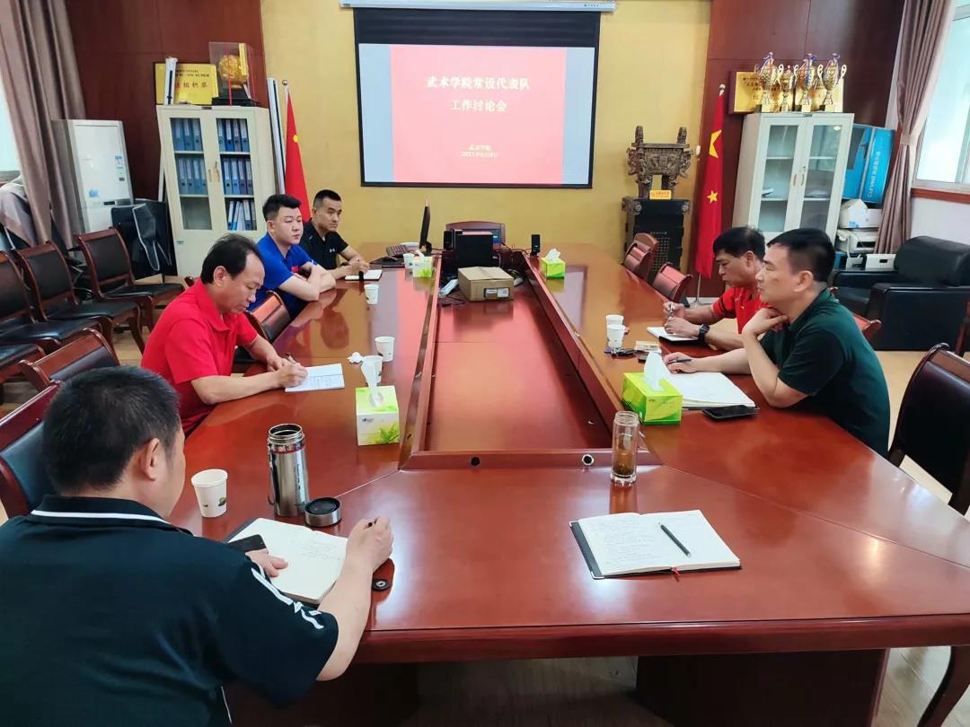 为全面了解我院常设代表队的训练情况,保持我院常设代表队的优势与特色,保证运动员各方面需求,2021年6月8日武术学院在学院会议室召开常设代表队工作讨论会。会议由武术学院党委书记王良明主持,武术学院竞赛督导石爱桥及各常设代表队主教练参加此次会议。