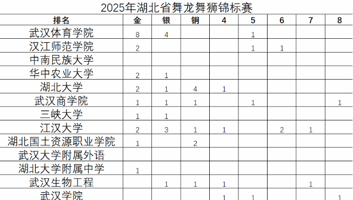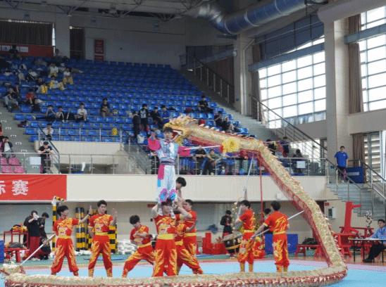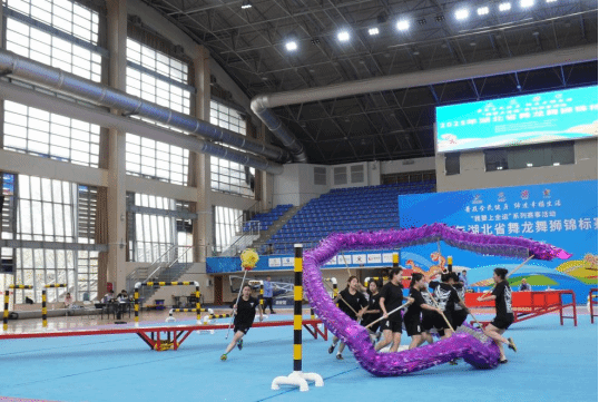 2025年4月4日至7日,“我要上全运”系列赛事活动——2025年湖北省舞龙舞狮锦标赛在武汉商学院北区体育馆隆重举行。本次比赛由湖北省社会体育管理中心与武汉商学院联合主办,吸引了全省众多高校,近400余名运动员的积极参与。武汉体育学院派出多支队伍参赛,涵盖男子组、女子组及混合组的舞龙、北狮、彩带龙等多个项目。经过激烈角逐,武汉体育学院舞龙代表队表现优异,一举包揽男子组舞龙自选、规定、竞速、障碍,女子组舞龙规定、竞速、障碍,彩带龙等8项冠军,充分展现了武汉体育学院在湖北省龙狮运动项目上的强劲实力。