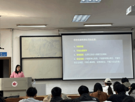 班会上,袁福妹首先通过视频的形式向同学们展示了几个校园内发生的真实案例——女研究生网恋三天被骗45万、陕西高校男生酒后乱性、高校数十人操场持械互殴等;上述真实案例令在座的同学们唏嘘不已,紧接着她强调了安全法治教育的重要性,并结合上述典型案例,深入浅出地讲解了犯罪、诈骗、校园贷、网络暴力等不法行为的危害和防范措施。