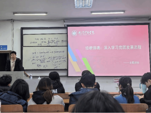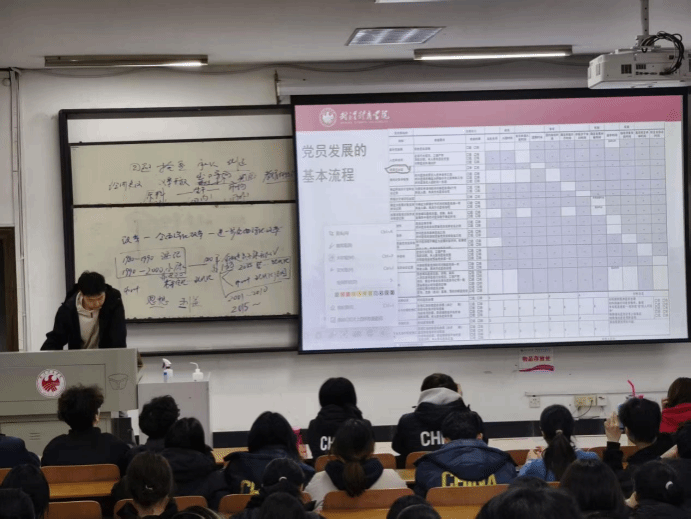 班会聚焦党团组织发展全流程规范运作。在团员发展板块,他详细讲解"六步走"标准化流程;在党员发展环节,则以动态流程图解呈现。他强调,"组织发展既是荣誉,更是责任与考验。"